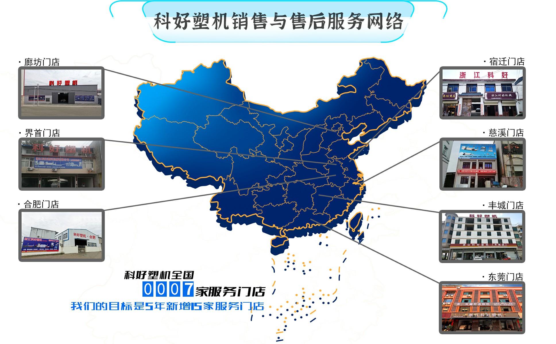 科好塑机前后创建了浙江慈溪门店,江苏宿迁门店,江西丰城门店,安徽界首门店,广东东莞门店、安徽合肥门店,河北廊坊门店天下7家办事门店。