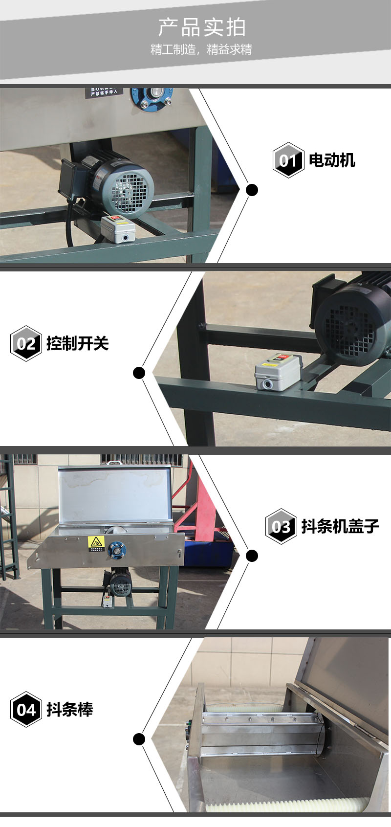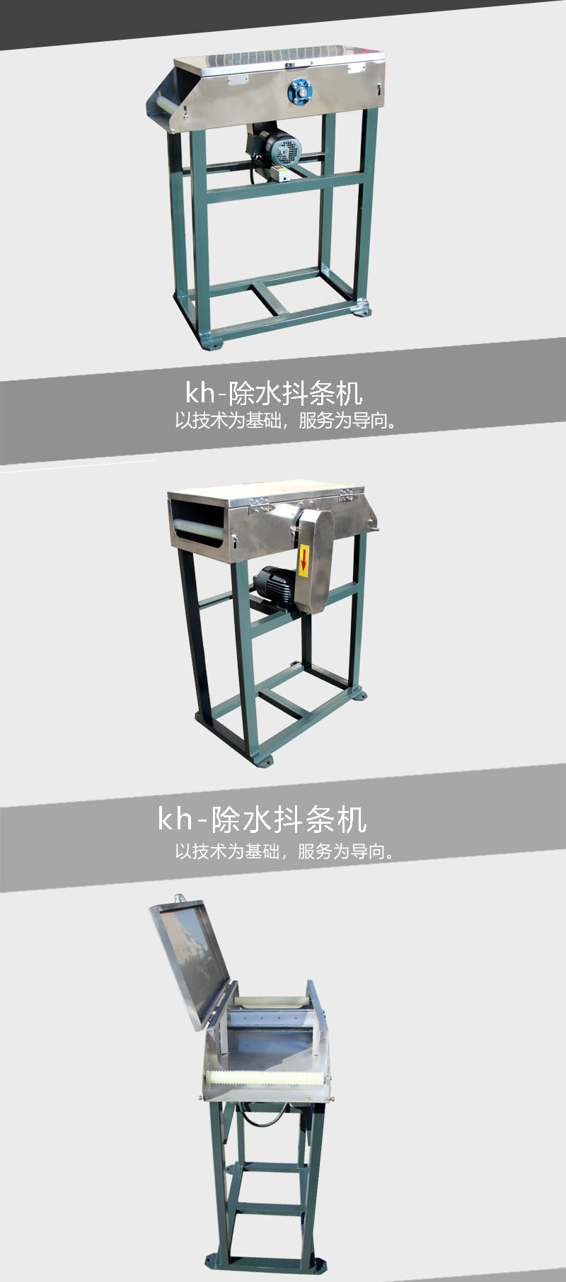 用处:合用于冷却水槽和立式风机或切粒机之间的架桥。 特色: 1:塑料拉丝颠末除水抖条机时,高频次发抖,撤除塑料拉丝外表水份。 2:材质为不锈钢,利用寿命长。